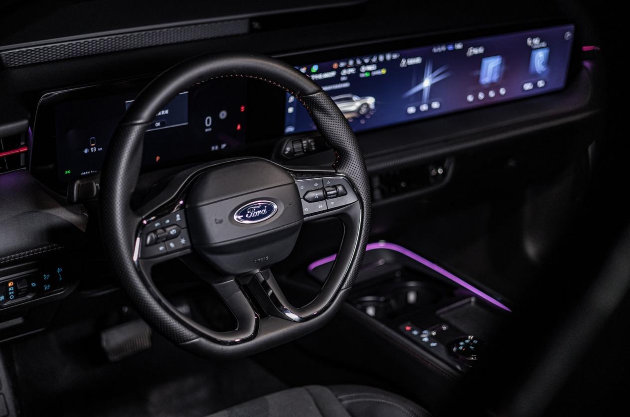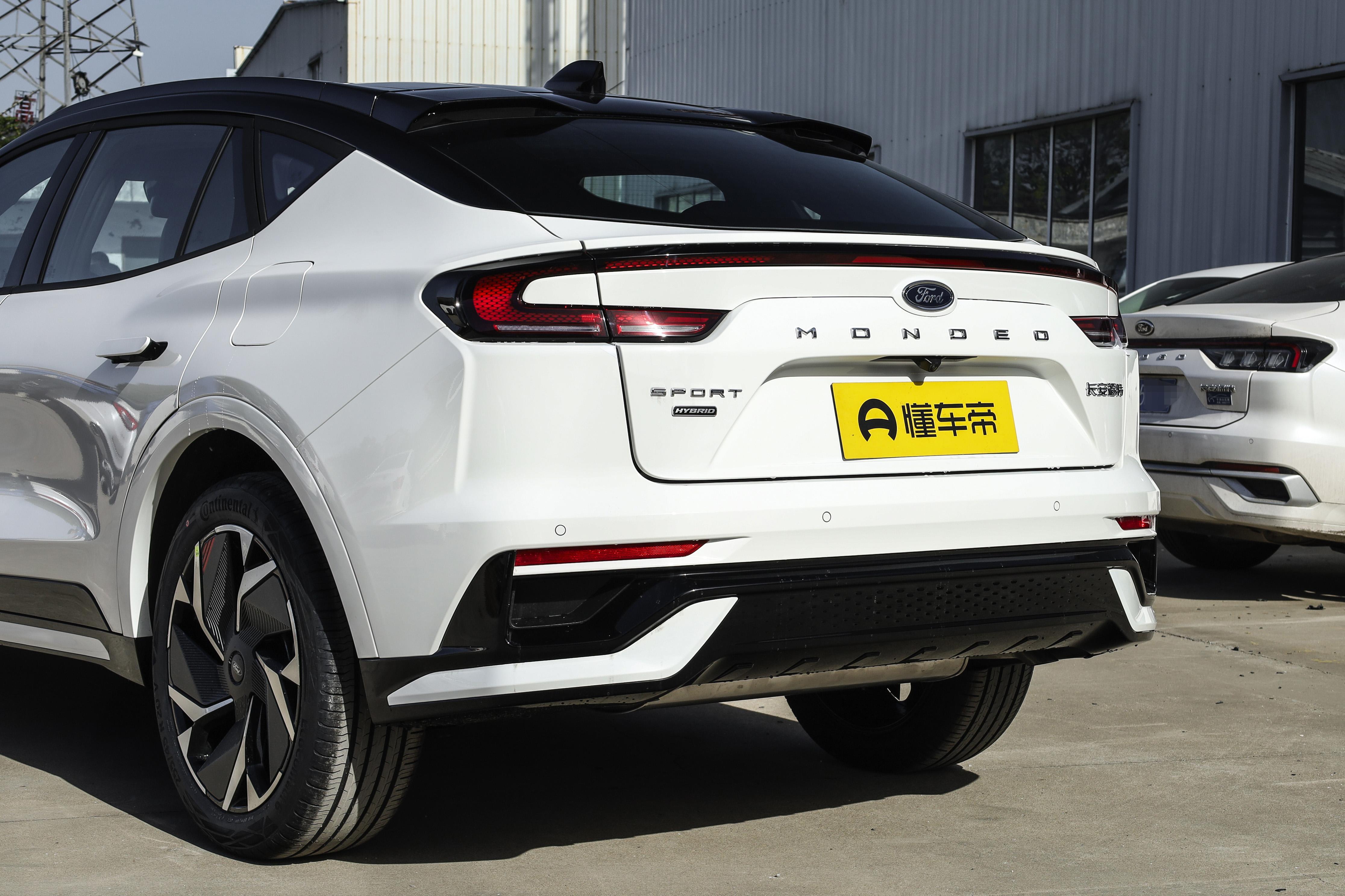 车身侧面,该车的造型则较为的别致,其轿跑的车身姿态配合黑色车顶很显运动感,同时整个车身姿态也很显协调,车顶尾部上方的黑色鲨鱼鳍,也在视觉上进一步提升整车的视觉效果。而车尾部分则是设计了绕式的尾灯组,并在灯组下方中间位置设计了福特的标识和字母来提升该车的辨识度。而下方的包围则采用了与前脸相呼应的设计,整体看上去颜值很高。
