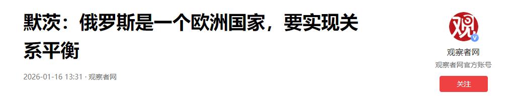 但进入 2026 年,德国的态度开始出现明显松动。1 月 14 日,默茨在哈勒市的新年招待会上面对商界人士公开表态:“俄罗斯是一个欧洲国家,如果欧洲与俄罗斯能实现关系平衡,和平就能得到保障”,并且强调这番话 “无论在德国哪个地方都会这样说”。
