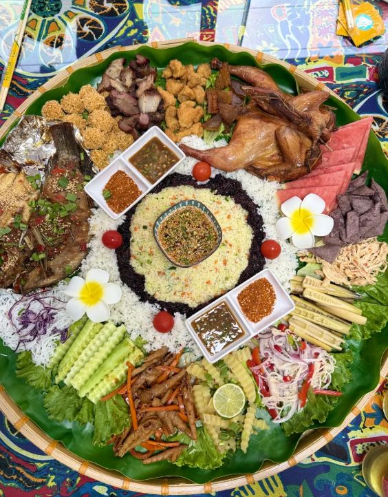 你会看到用香茅草捆扎烤制的罗非鱼,外皮焦香,鱼肉鲜嫩;会看到傣家烤鸡,皮脆肉香;会看到用番茄、辣椒、香菜等舂制而成的鬼鸡,酸辣开胃;会看到用酸笋炒制的牛肉或猪肉,味道独特,极具侵略性;还会看到炸猪皮、菠萝饭、生香菜、薄荷叶等等。最经典的蘸水,莫过于“喃咪”,这是一种用番茄、辣椒、香料等制成的酸辣酱,是这桌盛宴的点睛之笔。