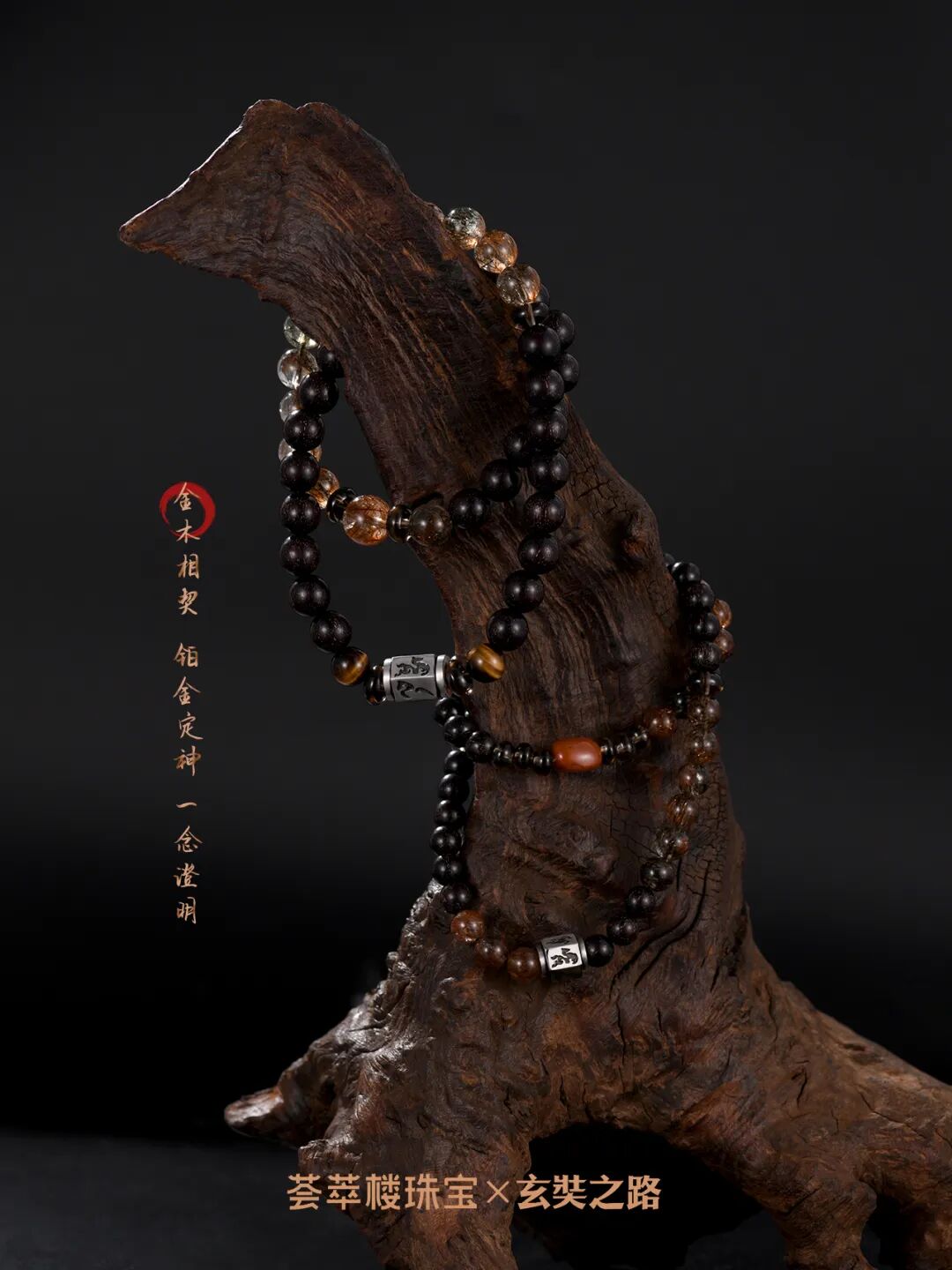 产品以坚韧铂金为骨,糅合木珠、宝石与结绳等东方元素,纹蕴祥瑞,电黑塑魂,通过现代设计语言将玄奘精神转化为可佩戴的艺术符号,旨在打造铂金中式美学新范式,致敬玄奘跨越千年的求索精神。
