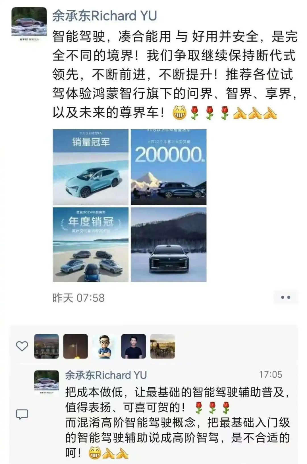 余承东在朋友圈评论区还发文表示,把成本做低,让最基础的智能驾驶辅助普及,值得表扬、可喜可贺的!而混淆高阶智能驾驶概念,把最基础入门级的智能驾驶辅助说成高阶智驾,是不合适的呵!