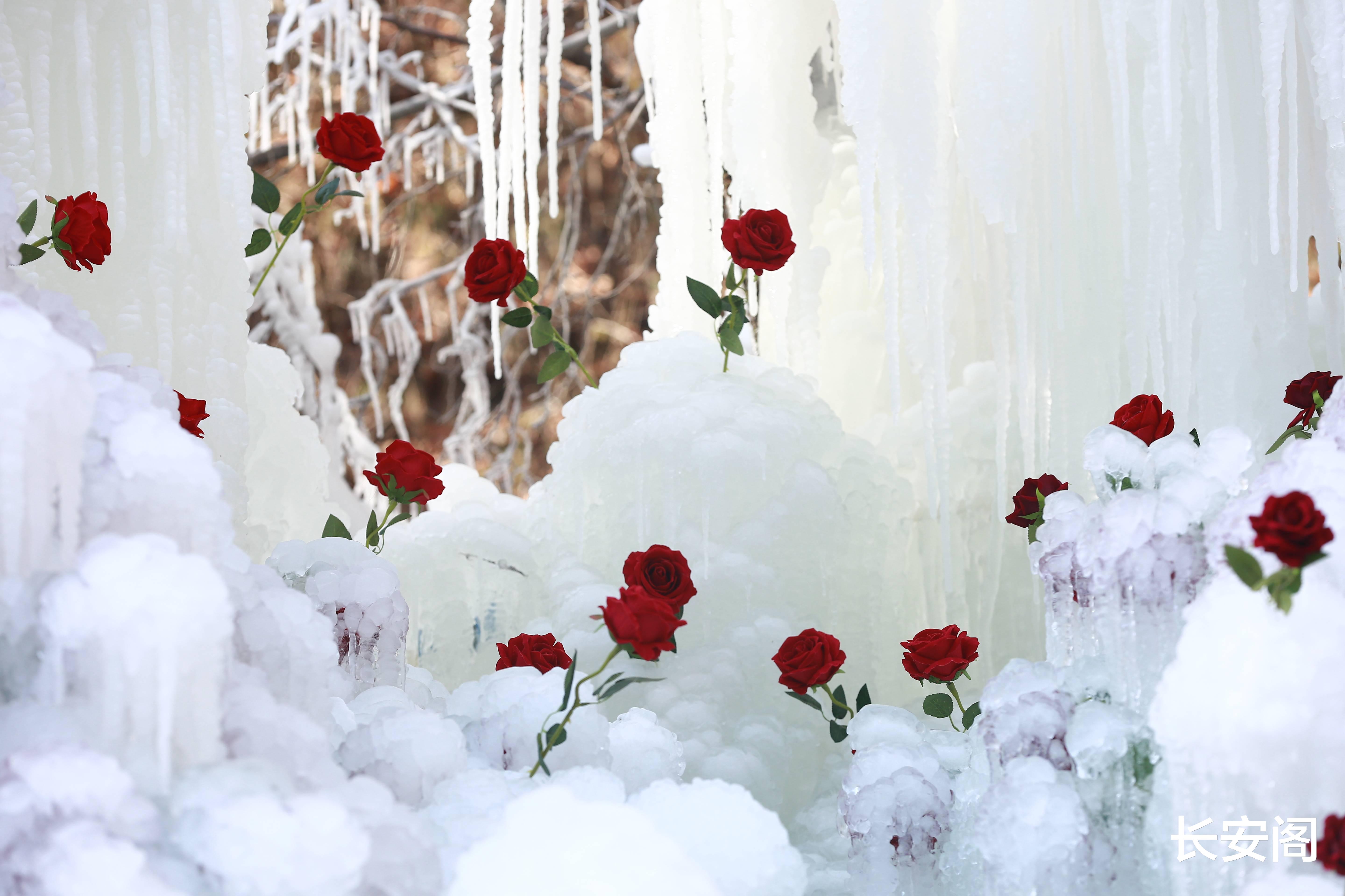 冰瀑垂挂的崖壁成了天然的画布,剔透的冰棱如水晶流苏般垂下,一朵朵红玫瑰却逆着寒意在冰间绽放。有的嵌在冰柱缝隙里,红得像跳动的火苗;有的簇拥成巨大的心形,在白雪皑皑的地面上撞出惊艳的色彩反差。冰的冷冽与玫瑰的炽热交织,像是把浪漫冻进了时光里,让冬日的萧瑟瞬间被揉碎成温柔的诗。