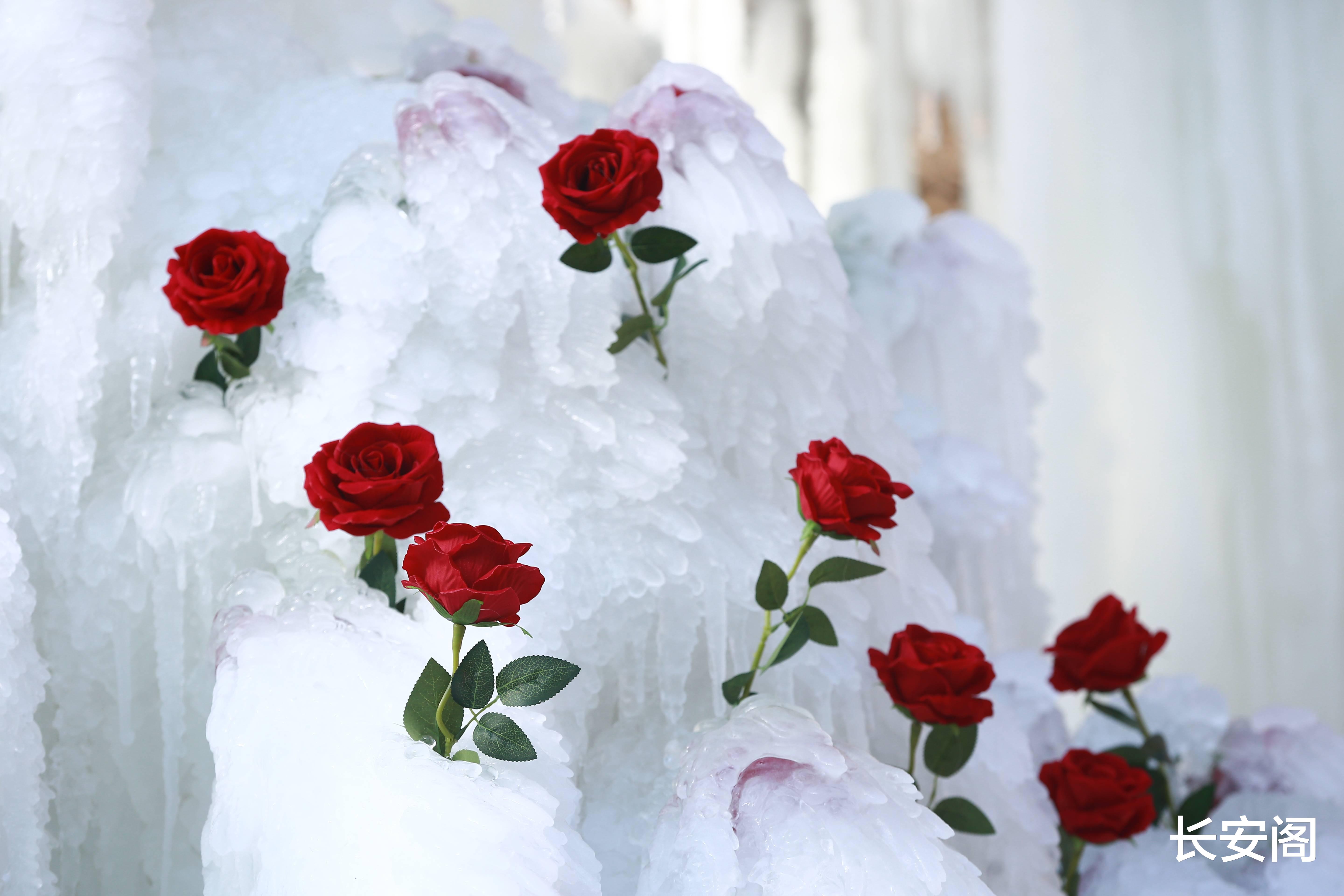 游客们踩着薄雪走近,举着手机定格这奇妙的画面。有人站在玫瑰心前比心,有人伸手轻触冰棱旁的花瓣,仿佛想接住这份跨越寒冬的爱意。阳光洒下来时,冰面折射出细碎的光,玫瑰的红在光影里晃荡,连空气里的寒意都好像被这份热烈融化了几分。
