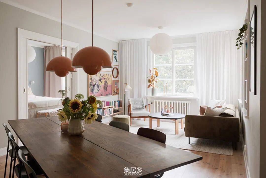 当北欧的极昼阳光透过三面落地窗倾泻而入,这间78平方米的转角公寓便成了光的容器。设计师巧妙利用建筑特有的非平行墙面结构,将斯堪的纳维亚的休闲美学推向新高度——亚麻沙发与橡木地板构成天然底色,上世纪中叶的复古边柜与现代极简吊灯在阳光下达成和解。