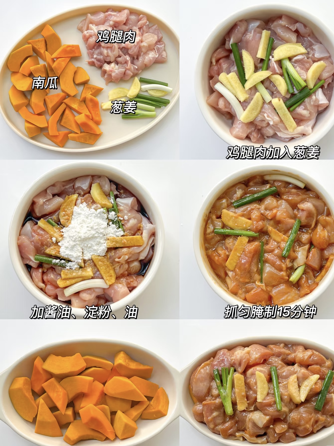 南瓜选老一点,颜色越深越甜。去皮去瓤,切成滚刀块,厚度跟麻将差不多,太薄会蒸成糊,太厚难熟。拿个大平盘,先铺南瓜,再摆鸡肉,让肉躺在南瓜“床垫”上,蒸的时候鸡油往下渗,南瓜吸饱肉香,双赢。