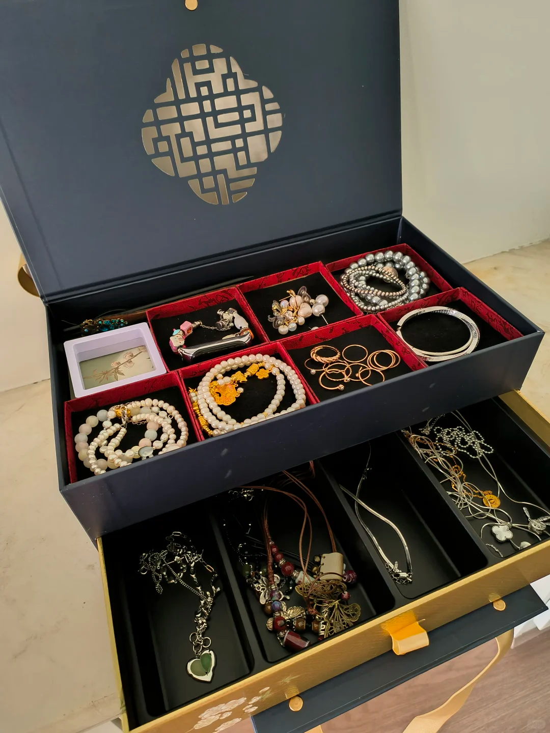 另外只要把月饼拿出来,不用进行任何隔断的设计,每个格子的大小刚好可以放得下一条珍珠项链。