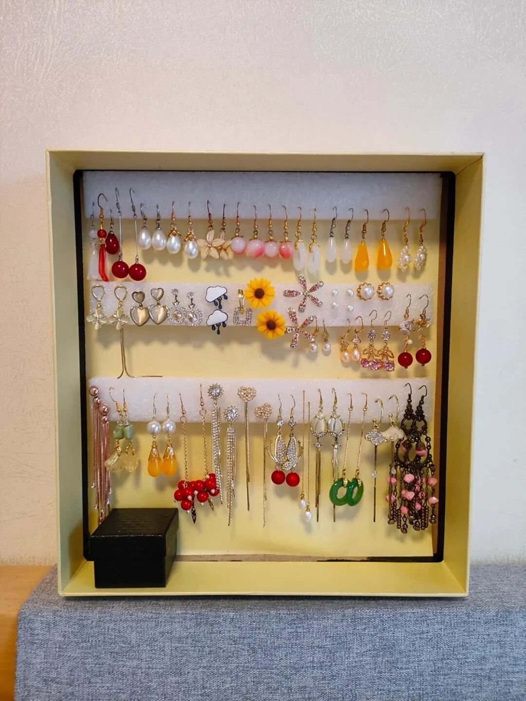 或者是将月饼盒里面的隔断自行调节。可以用海绵条裁剪出绘本盒的大小,然后用绒布将它的包裹一格一格的可以用来收纳戒指和耳环。