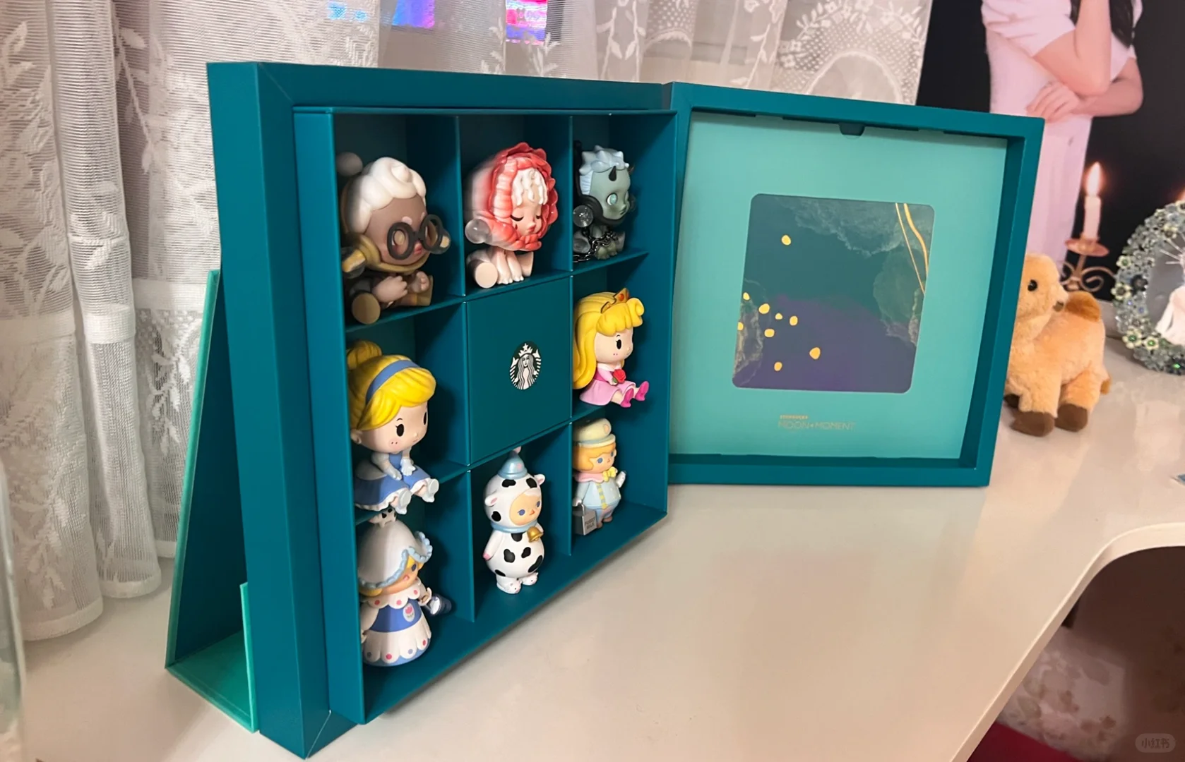 看着月饼盒子一格格的设计,正好用来收纳盲盒。宽度也正好可以立起来摆放,非常具有展示的作用。