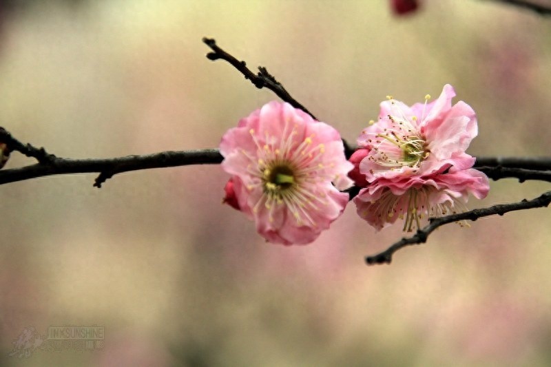 “高树临溪艳,低枝隔竹繁”,诗人起笔寥寥十字,就描绘出一幅声色并茂的梅竹图。梅花是这幅画的主体,它高踞于涓涓流水旁边的峭石上,花色娇美艳丽,枝干错落有致,在低垂的花枝那边,是一片繁茂的翠竹。红梅与翠竹交相辉映,梅竹与流水相得益彰,显得画面热烈而淡雅,奔放而凝重,令人爽心悦目。这两句诗运用烘托手法,极力点染出环境的幽美,突出梅花的风韵,表现了诗人内心淡淡的喜悦。