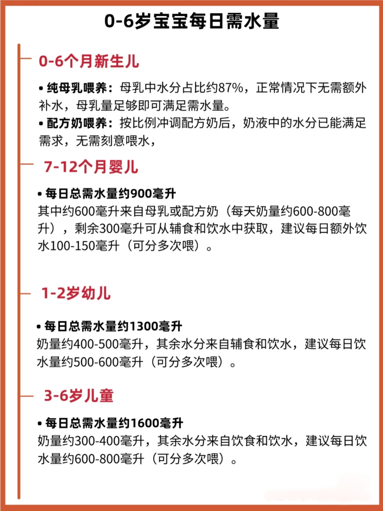 0-6个月:健康情况下无需喂水,母乳或配方奶就是最好的水源。