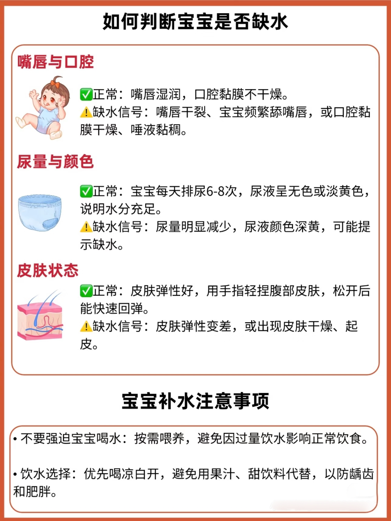 警惕脱水信号:尿量明显减少(每天少于6次)、尿液深黄、嘴唇干燥、哭时眼泪少、前囟门凹陷、异常嗜睡。一旦出现这些迹象,请立即就医!