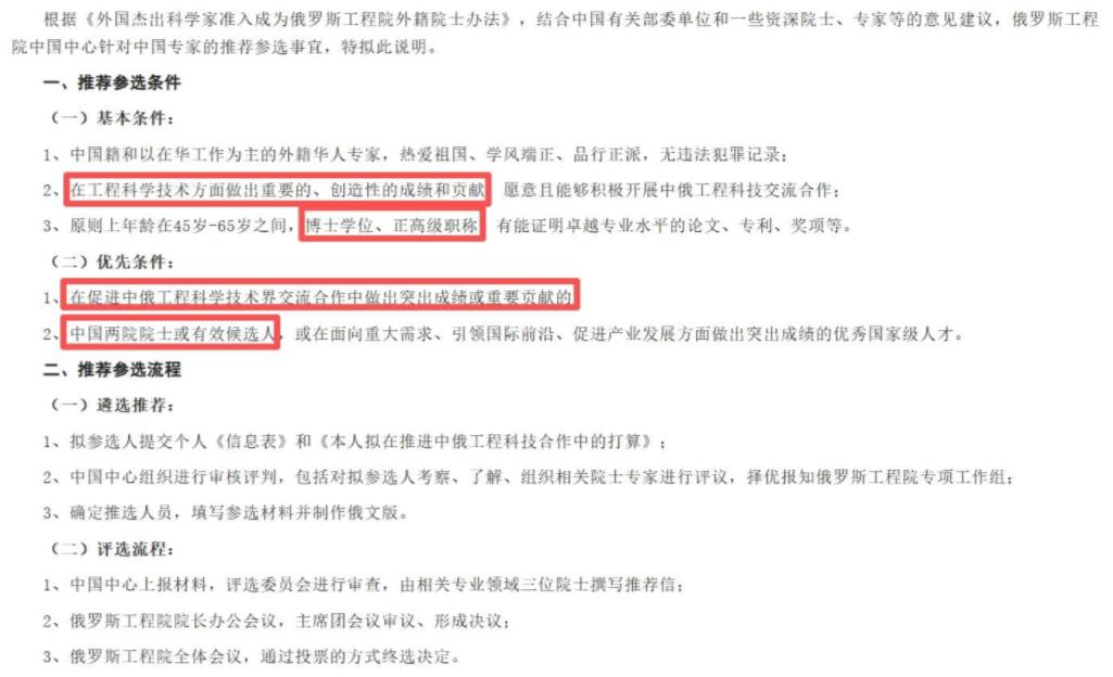 要想当选俄罗斯工程院外籍院士,要满足一些条件,比如年龄在45岁-65岁,博士学位,正高级职称,在工程科学技术领域做过重要的、创造性的成绩和贡献等等。
