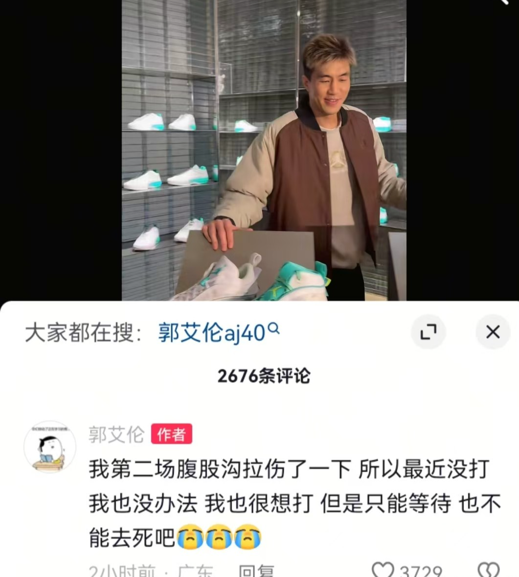 郭艾伦回应不能上场的具体内容如下:“我第二场腹股沟拉伤了一下,所以最近没打,我也没办法,我也很想到,但是只能等待,也不能去si吧。”