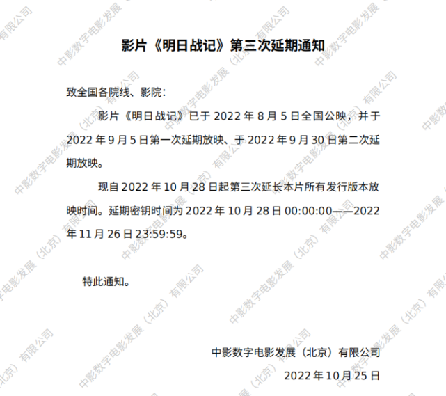 第三,10月25日,不认命不服输的古天乐再次将他的院线电影《明日战记》的窗口期延长至11月26日,这已经是第三次延长公映密钥了。