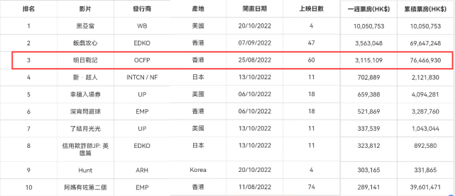 其次,香港本土票房。《明日战记》自上映以来,多次过关斩将,分别将周星驰的《功夫》,九把刀的《那些年,我们一起追的女孩》,以及郭富城、梁家辉的《寒战2》拉下马。