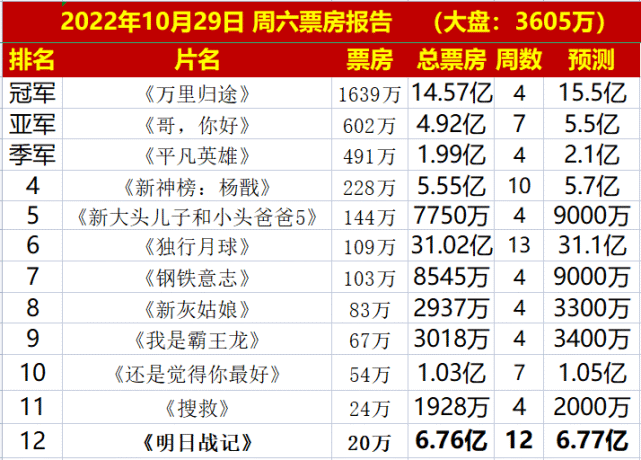 首先,中国内地票房。10月29日周六内地票房排行榜出炉,单日大盘共轰下3605万,本周继续保持没有新片上映的节奏。