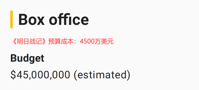 获悉,IMDB已经发布该片的预算成本为4500万美元(约3.26亿人民币),这也是《明日战记》最为准确的投资成本。