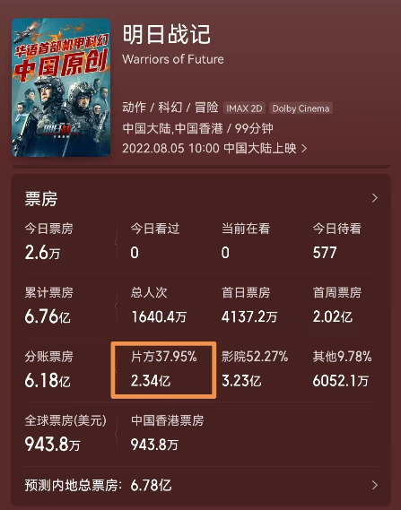 2.34亿加上2300万,大约回本2.57亿,而预算成本是3.26亿,还有将近7000万的支出暂时没办法收回来,亏损已成定局,但也不会亏很多。