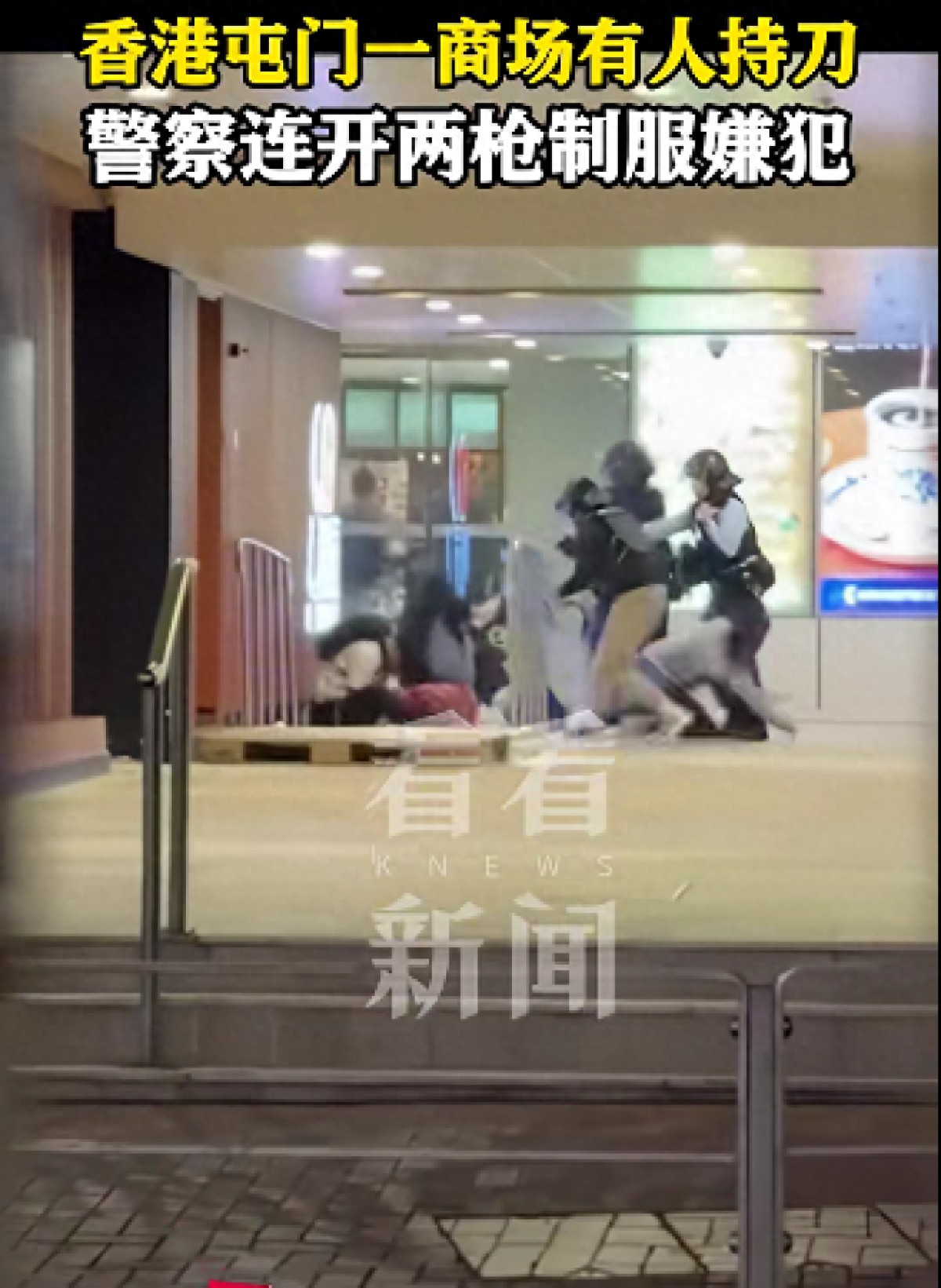 1月15日晚上7时许,香港屯门一商场有警察连开两枪击毙持刀男子,从网上流传监控画面显示,嫌犯劫持女子作为人质,当准备挥刀插向人质瞬间,警方开枪,嫌犯随即痛苦倒地,被劫持女子被其他警官拉开远离嫌犯控制。