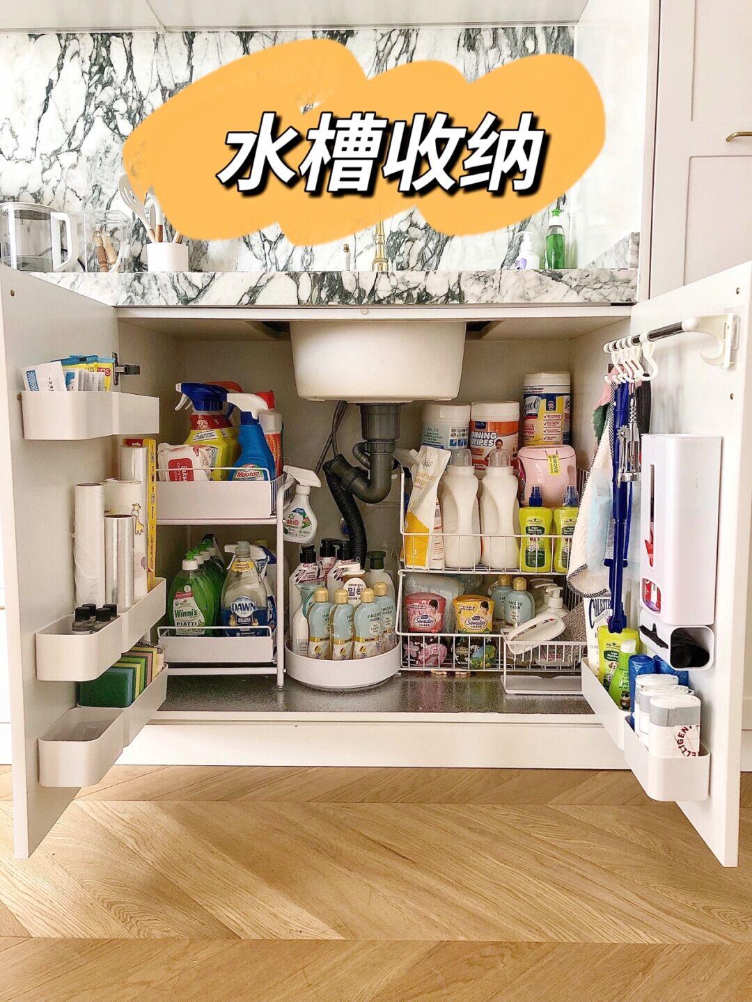 其实厨房水槽下方和门板区域,可以作为厨房清洁用品的“黄金收纳地”,把这里利用好,清洁用品就能集体归位。