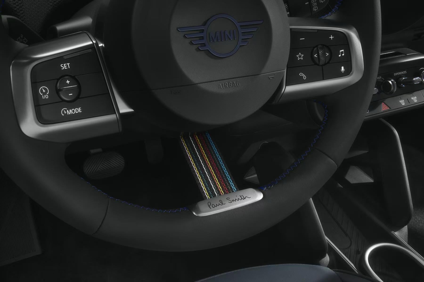 MINI Paul Smith设计师款在内饰方面也进行特殊设计,新车方向盘和黑蓝双色织物龙葵蓝Vescin运动座椅均配备Paul Smith设计师专属签名,迎宾踏板上印有“Every day is a new beginning(每天都是全新的开始)”字样。此外,MINI 的OLED圆屏在个性化模式下还新增三种不同的Paul Smith专属背景。