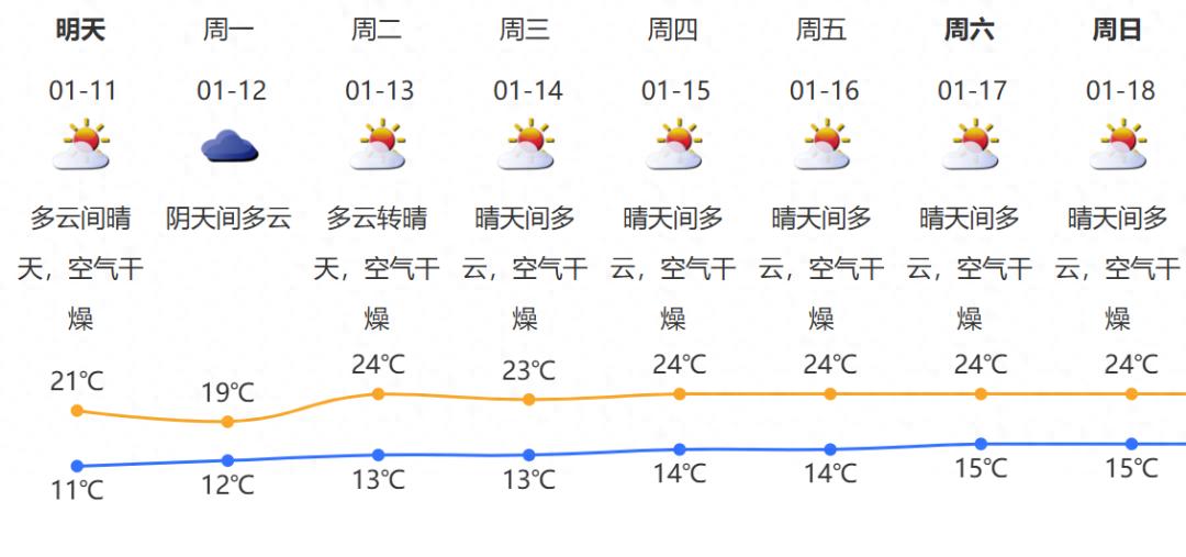 1月13日—17日晴天干燥为主,气温小幅波动,早晚清凉,白天舒适。