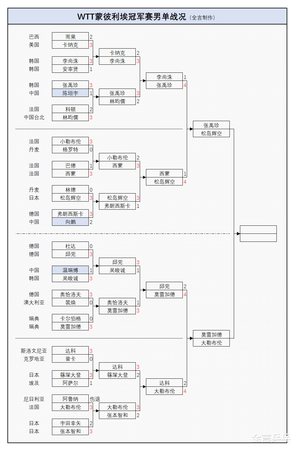 在此之前,国乒男单3位选手温瑞博、陈垣宇、向鹏早已先后一轮游被淘汰,而晋级8强的运动员在1/4决赛的战况如下: