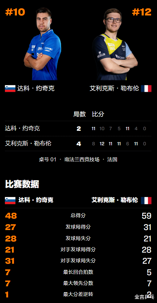 第五局背水一战的达科打出了不错的状态,开局迅速连得7分气势如虹,大勒布伦随即反击追至4-8紧接着输2分4-10出现局点,挽救2球后以6-11再负未能结束战斗。