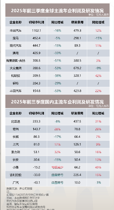 在这场全球性的行业调整中,为什么中国车企能够逆势而上?关键在于中国企业在智能电动化转型中持续投入所形成的技术领先优势。看看研发数据就一目了然:国内主流车企前三季度研发费用普遍保持两位数增长,比亚迪更是投入437亿元,同比大增31%。而同期,大众、宝马的研发投入却分别下降了9%和15%。