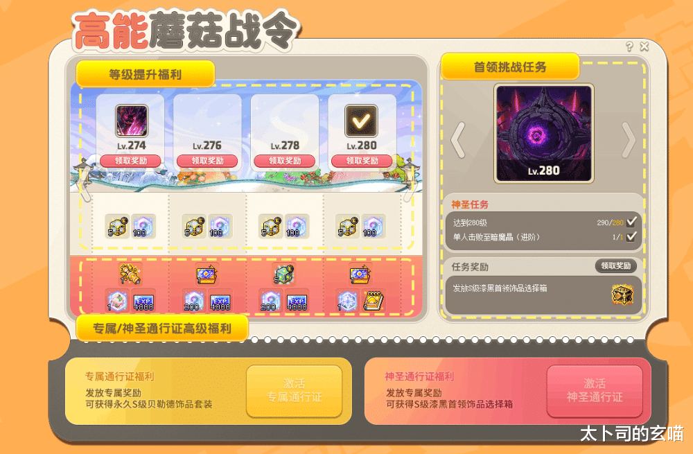 “高能蘑菇战令” 专为新角色打造,蘑菇专属通行证与神圣通行证两大福利体系同步开放,专属蘑菇装备箱、熊猫宠物、S 级漩涡饰品箱、永恒星之力 18 星强化券等成长道具应有尽有。冲至 280 级更能解锁阿尔特里亚 5 级徽章交换券、大师级冒险家称号等核心奖励。