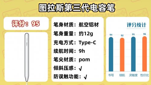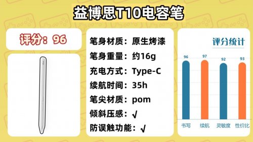 这款电容笔采用了原生烤漆工艺,笔身手感细腻,握持体验较为舒适。不过单支笔重量较重,约16g,相比普通电容笔要沉一些,长时间使用容易让手腕感到疲劳。书写方面,它配备了与原装笔同款的POM笔尖,并支持防误触设计,书写流畅,阻尼感适中。续航上,它支持常见的Type-C接口充电,最长可使用35小时左右,能够满足长时间的绘画和书写需求。此外,它还提供数十种自定义快捷操作,能够根据需求灵活设置。不过它在笔杆中间布局了充电口和开关键,使用时可能会感到不够顺手,也容易误碰,影响使用体验。
