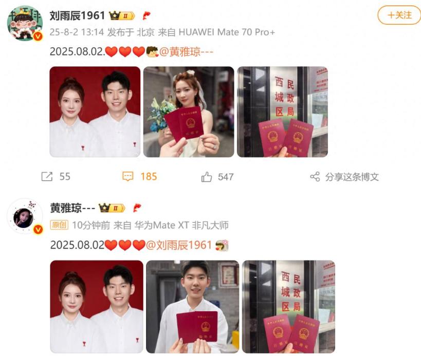 今年8月2日,两人选择在巴黎奥运会夺冠一周年这个特别的日子,正式领证结婚。