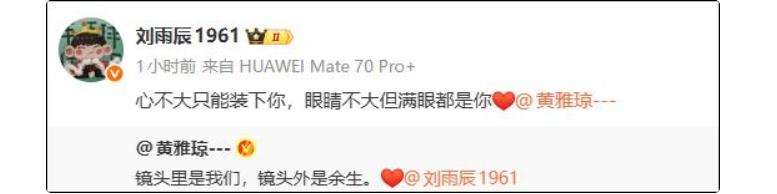 随后,刘雨辰转发回应:“心不大只能装下你,眼睛不大但满眼都是你。”黄雅琼则回复称:“说得很真实。”这小两口的互动,真是把网友们都给齁到了。