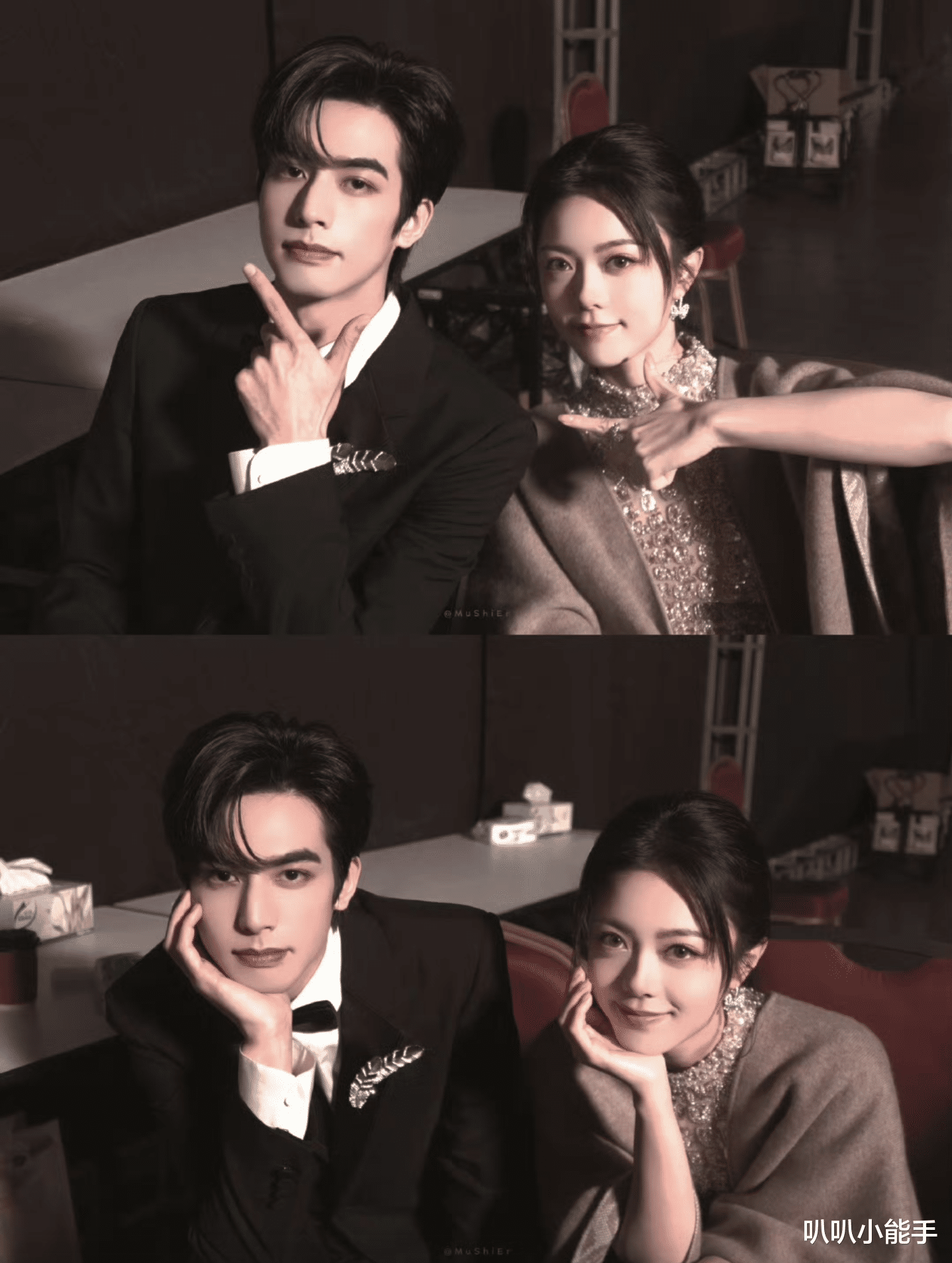 再看穿搭,宋威龙一身黑色西装配领结,胸前别着银叶子胸针,头发梳得纹丝不乱,侧脸轮廓像“大理石雕”,赵今麦穿浅灰披肩配亮片内搭,耳环闪到像“小灯泡”,俩人手托脸的pose一模一样,像“复制粘贴的甜蜜模板”,这种“默契感”,比我跟闺蜜拍大头贴还要同步!