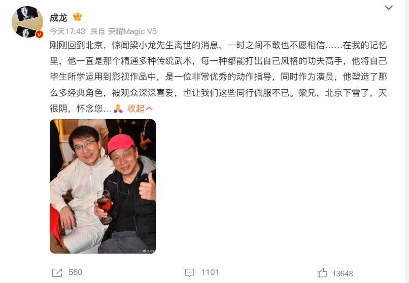 他走了,成龙大哥发了句“北京下雪了,天很阴,怀念您”。周星驰也只回了句“永远怀念梁小龙先生”。这两位平时惜字如金的大佬,都为他动了真情。