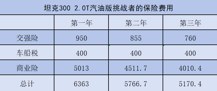 接着是保险/税费方面,坦克300 2.0T车型的车船税为400元,交强险(5座)为950元,首年必交项目费用为1350元。同时新车还需要购买商业险,仅购买基本险,按第三者责任险赔付额度为100万元来看,该款车的商业险费用为5013元,首年合计总费用为6363元。如果在不出险的情况下,第二年能享受9折优惠,第三年为8折,费用有所下调,因此如果日常小剐蹭维修费用在500元以内,不建议用户报保险处理。