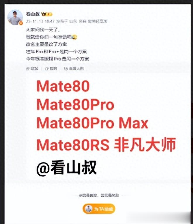 此次系列在机型命名上有明显调整,依旧保持四款机型,但 Mate 80 Pro Max 将取代此前的 Mate 80 Pro+。背后原因是产品方案调整,今年标准版与 Pro 版采用同一方案,打破以往 Pro 版与 Pro + 版共用方案的惯例,这一变动或体现华为对不同定位机型功能分配的新考量,意在更精准满足不同用户需求。