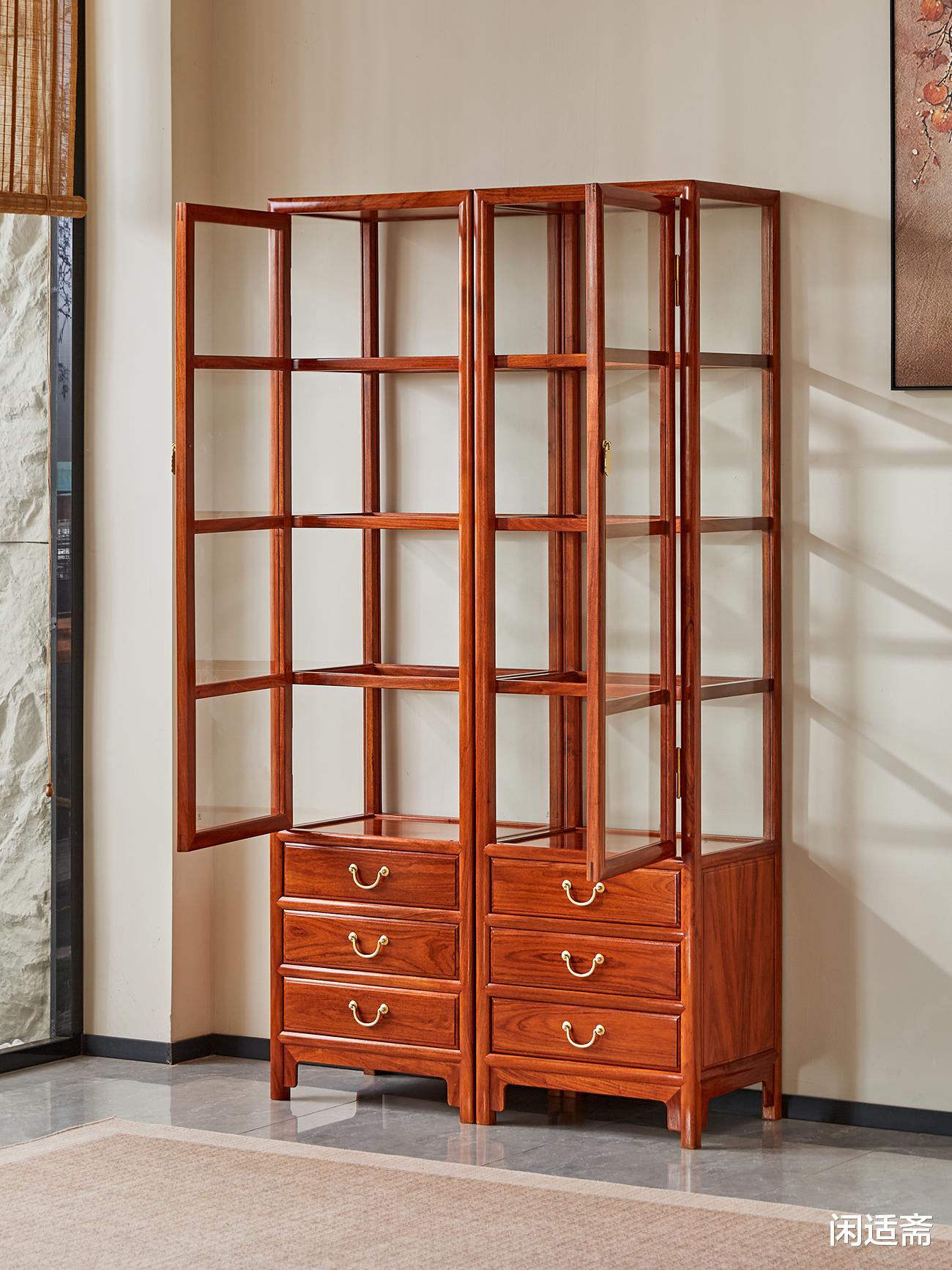 玻璃展示柜是中式家具与现代实用需求融合的经典品类,尤其成对陈设更显对称庄重之美。这对缅甸花梨玻璃展示柜,以珍贵花梨木为材,秉持素简设计理念,将收纳与展示功能完美兼顾,既延续了传统木作的温润质感,又适配现代多元空间,成为兼具实用与美学价值的雅器。