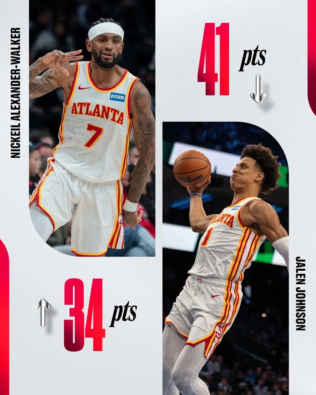 就在本场比赛之前,老鹰主场130-123击败骑士,这场杰伦约翰逊拿下29分12篮板12助攻三双,而亚历山大-沃克也得到了28分3篮板1助攻1盖帽1抢断(投篮21中9,三分13中5)。