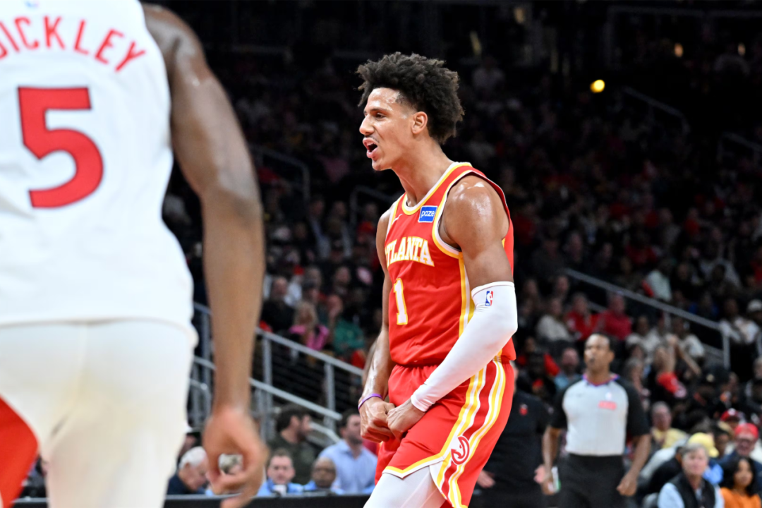 在进入生涯的第5个赛季,杰伦约翰逊打出了全明星乃至最佳阵容级别的表现,至今场均可以拿到22.9分9.8篮板7.3助攻1.6抢断,得分、助攻全部生涯最高,且三项命中率达到53.9%/40.3%/78.3%,真实命中率63.3%。