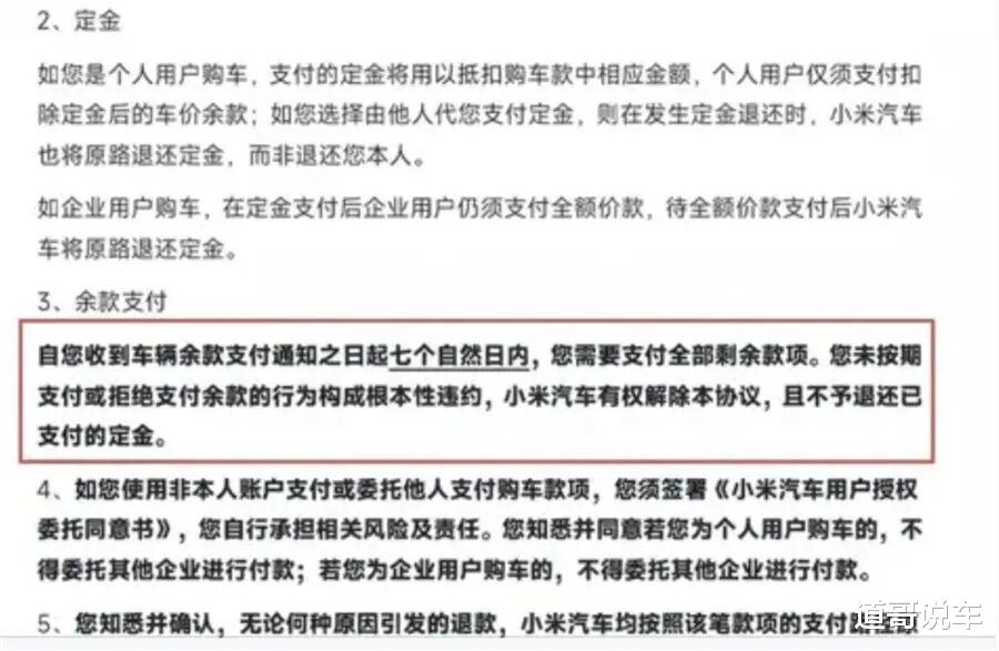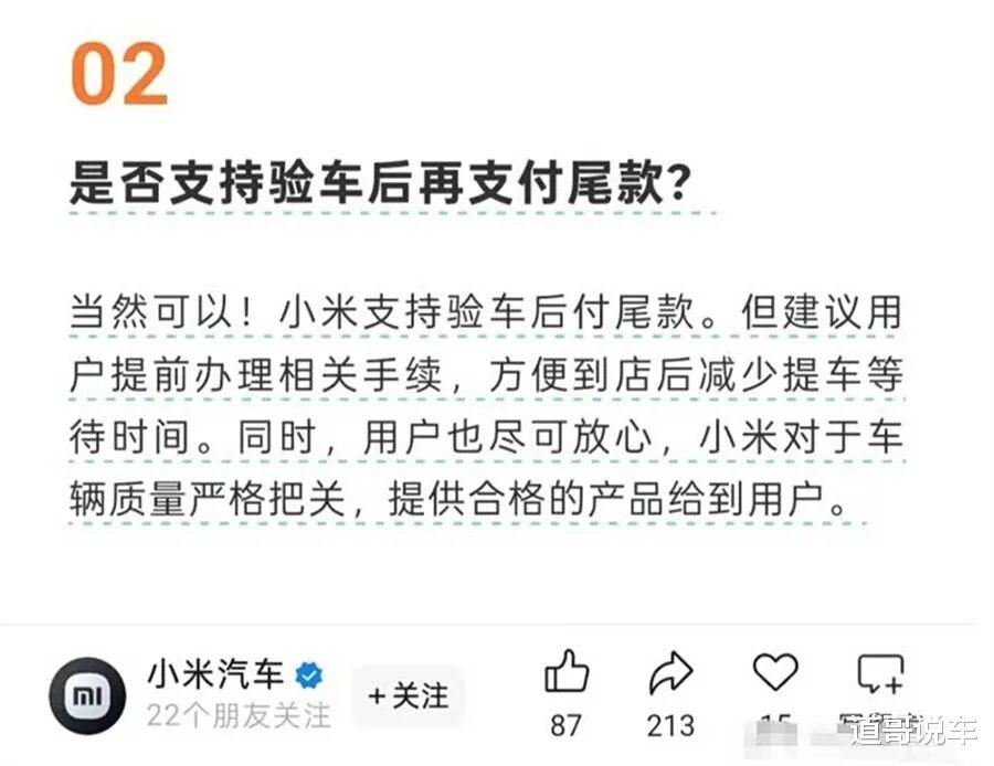 更让消费者困惑的是承诺与现实的落差。小米官方公众号明确写着“支持验车后付款”,实际操作却完全相反。这一做法与特斯拉《订购协议》里明确规定的“车辆到店验收后支付尾款”形成鲜明对比。