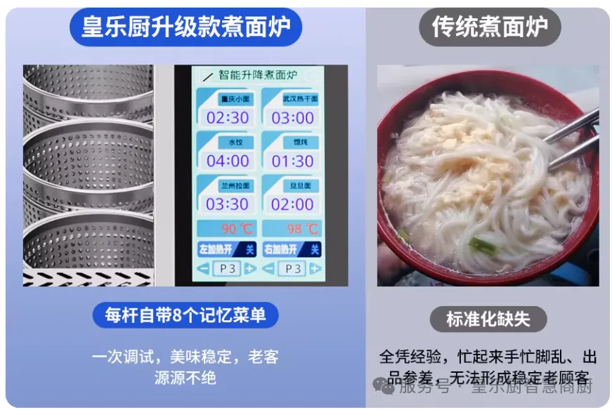传统烹饪技艺依赖厨师经验,人员流动常导致菜品质量波动。皇乐厨自动升降煮面炉的一键式操作界面,让新手员工也能快速上手,轻松烹制出专业水准的杀猪粉。