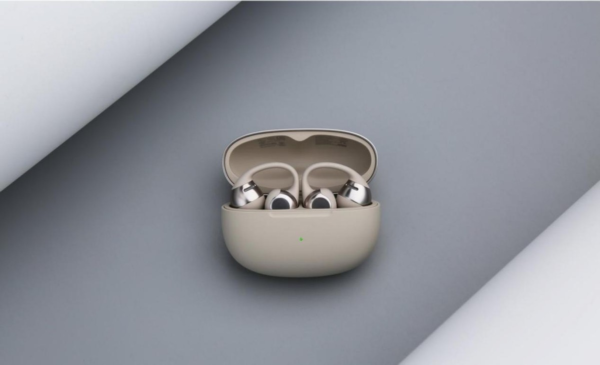 佩戴设计上,就是耳夹式常见的U 型小哑铃设计,看着很简约。中间那根弧形软梁叫 “空气弧”,还挺有意思的,硅胶裹着镍钛合金丝,能随便弯折,戴在耳朵上一点不压耳,还稳得很,不会晃来晃去。