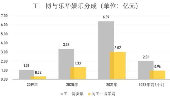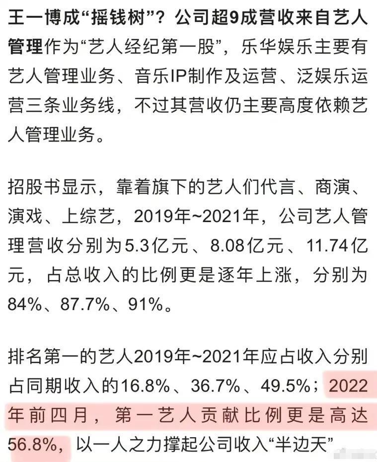 根据乐华娱乐的招股书,王一博在2022年前四个月的收入贡献比例高达56.8%,而在2020年至2022年4月期间,乐华的营收中有80%以上是由他贡献的。从3200万到3亿,再到2022年前四个月的近亿收入,王一博在不到四年的时间里为乐华带来了12亿的营收,个人收入达到5.6亿。