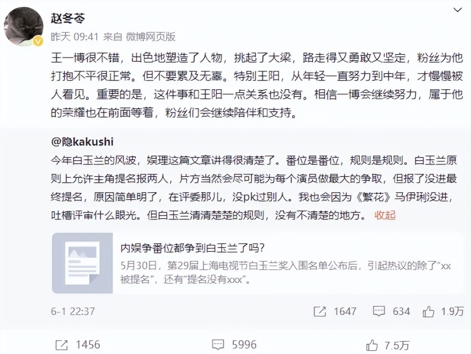 粉丝对王一博的支持,虽然充满了热情,但很多时候却是一种自我感动的独角戏。他们认为王一博在乐华娱乐受到不公平的待遇,应该自立门户。然而,他们忽视了王一博个人的选择和发展需要,以及娱乐圈的复杂性和现实性。王一博的白玉兰风波,应该成为粉丝行为的一次反思。粉丝在支持偶像的同时,更需要理性和尊重。他们应该尊重行业规则,尊重他人的权益,尊重偶像的个人选择和发展需要。只有这样,才能真正为偶像的发展提供积极的支持和帮助。