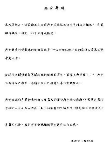 信息来源新京报2011-08-23报道:张柏芝与谢霆锋已达成离婚协议。