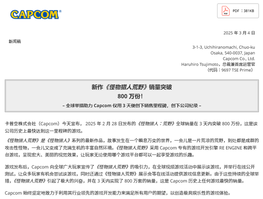 2025年,系列最新作《怪物猎人:荒野》发售仅三天即突破800万销量,成为卡普空历史上销售速度最快的作品。