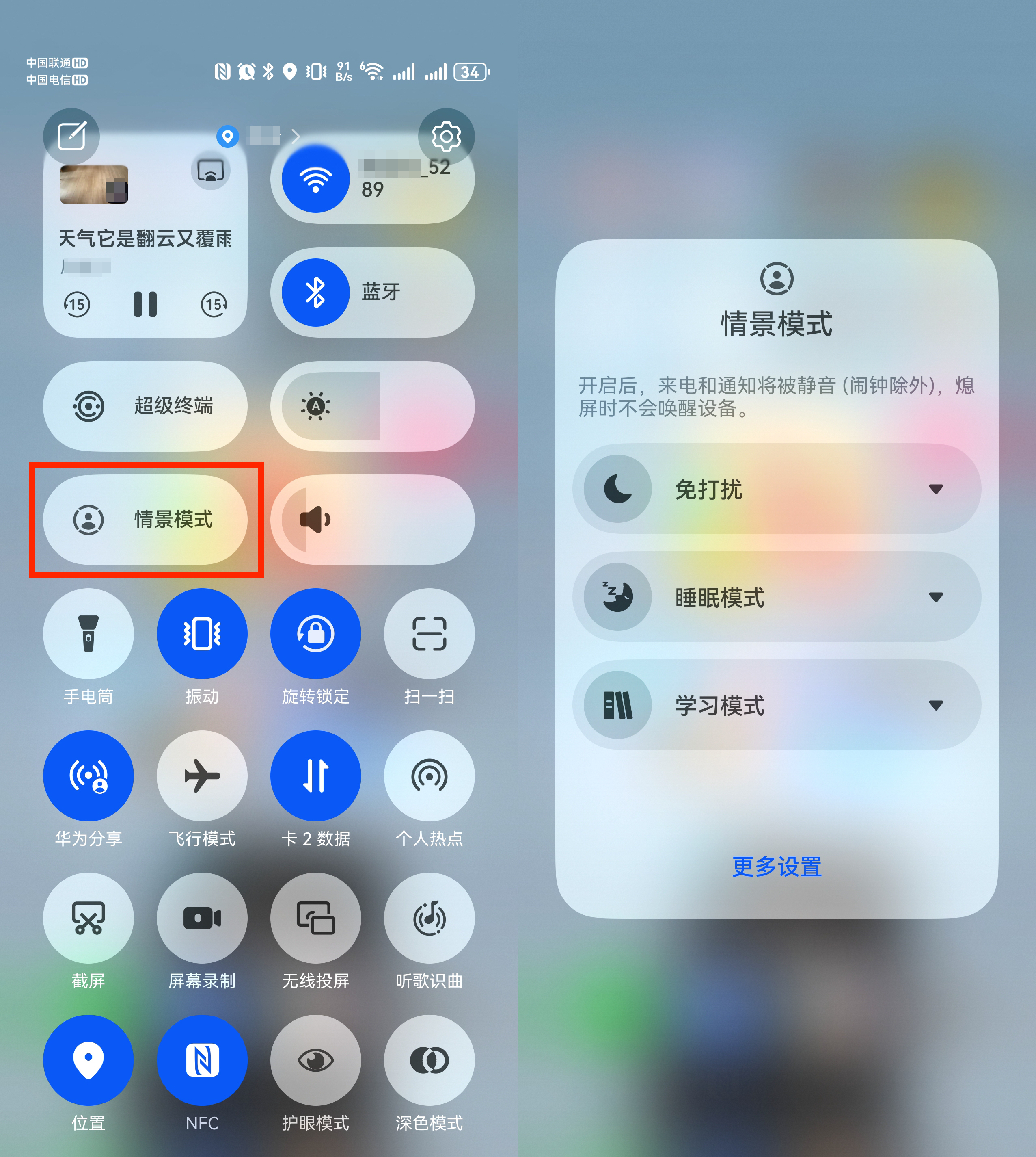 还有,如果开了“免打扰”模式,所有消息通知都会静音,你可以在设置里找“情景模式”确认状态,也能下拉主页菜单栏,找到情景模式自行设置。