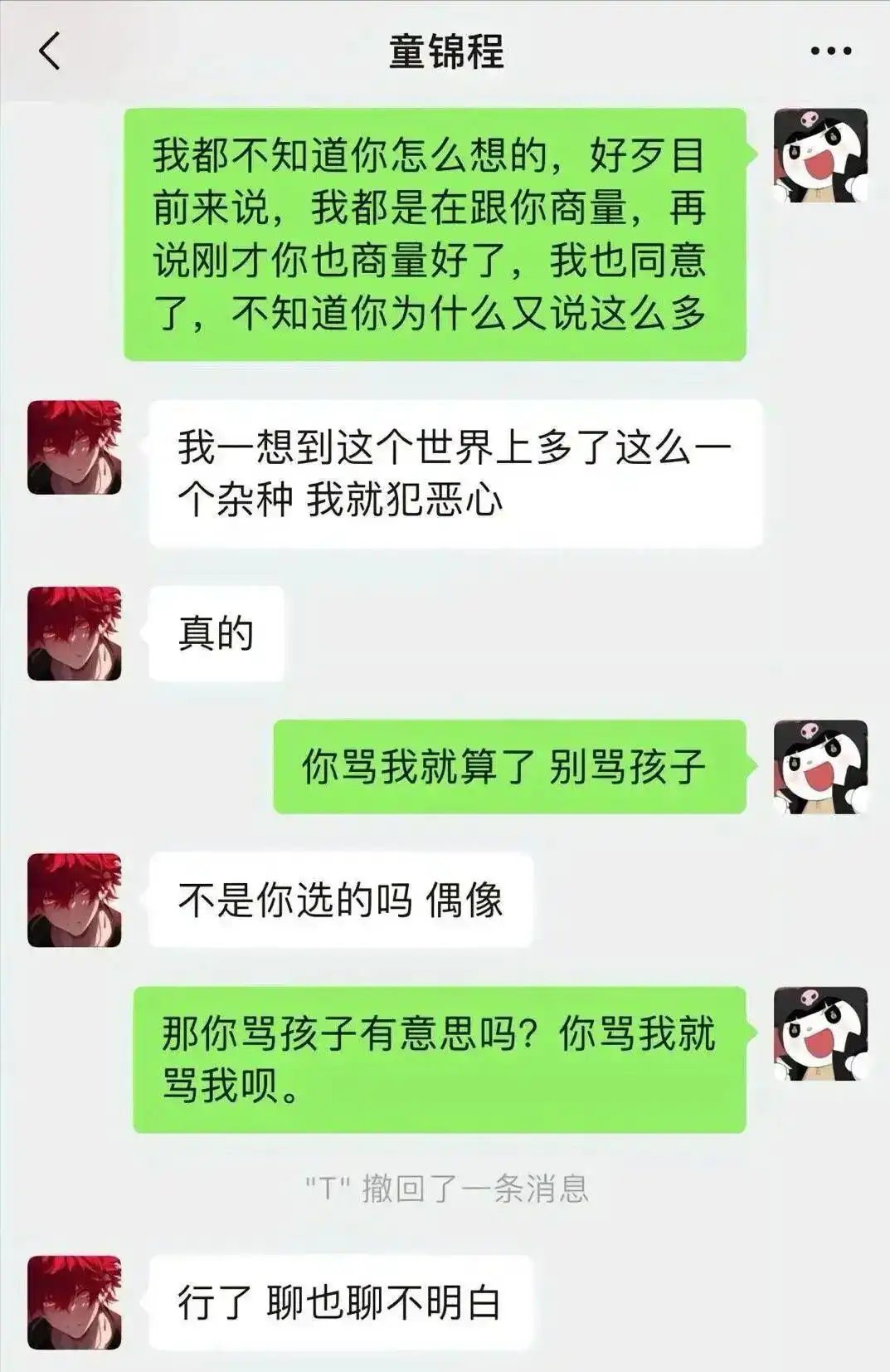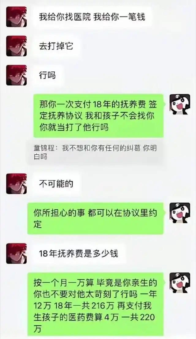 戏剧性的反转在于,那个在直播间高呼 "男人要负责" 的 "情圣",现实中第一反应竟是 "打掉孩子",协商破裂时甚至辱骂未出生的孩子为 "杂种"。从最初提出每月 3000 元抚养费,到涨到 5000 元却要求 "签协议彻底撇清关系",再到发下毒誓 "多给一分就断子绝孙",童锦程的操作完美演绎了从逃避责任到破罐破摔的全过程。