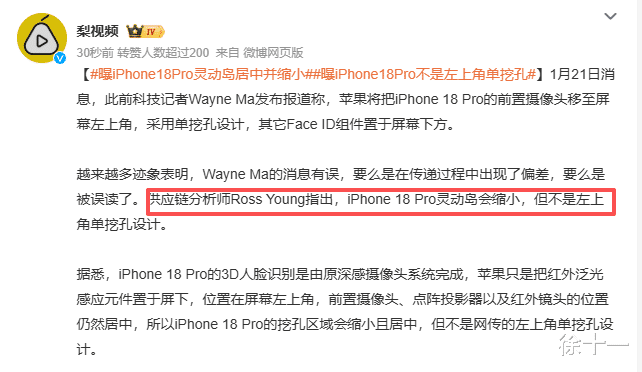 前段时间iPhone18Pro传的沸沸扬扬的左上挖孔屏,最新说法又来了。